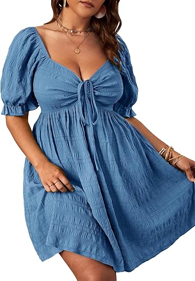 Womens Plus Size Summer Dresses Sweetheart Neck Puff Short Sleeve Tie Swing A Line Midi Dress