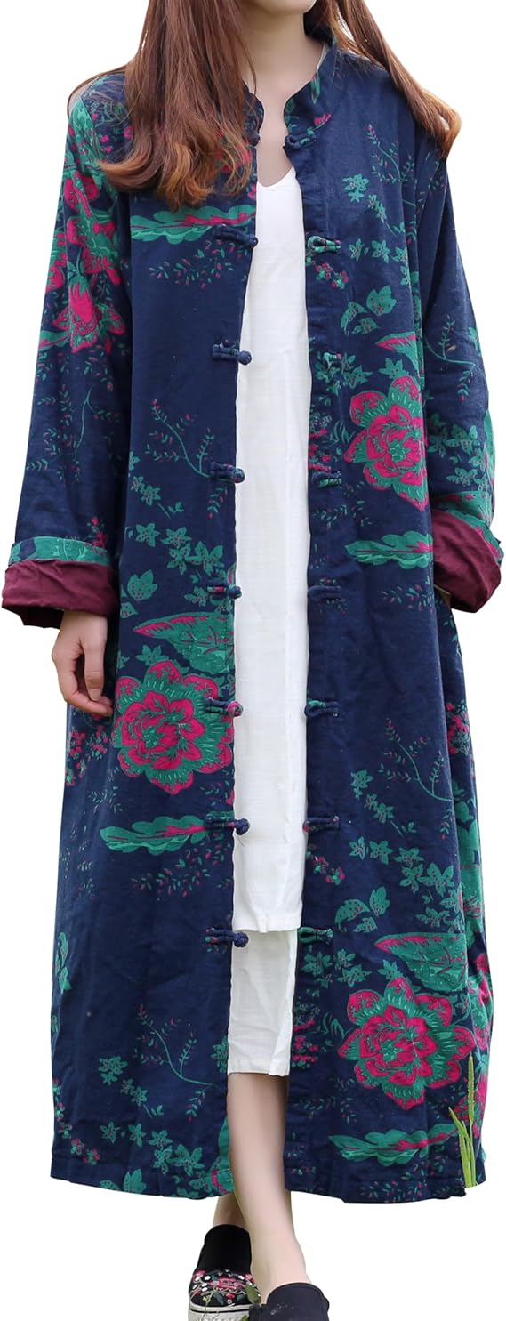 Women's Trench Coat Long Cotton Linen Floral Print Jacket Cottagecore Clothing Casual Plus Size multicolored Outerwear