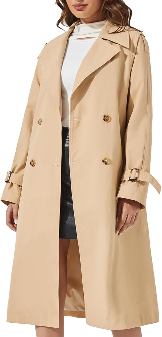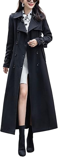 Women's Double Breasted Long Trench Coat Windproof Classic Lapel Slim Overcoat with Belt