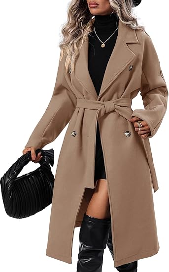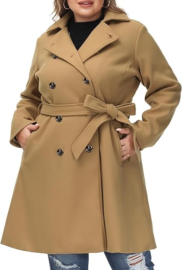 Women's Plus Size Wool Dress Coat with Belt Double Breasted Pea Coats Mid-Long Trench Coat