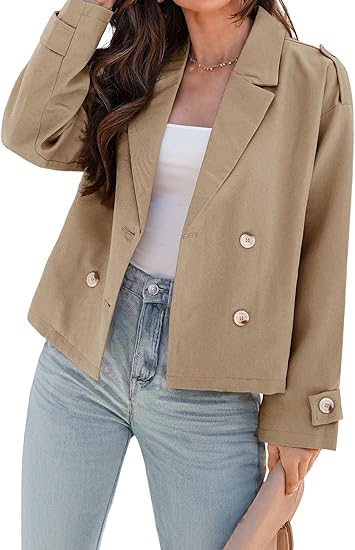 Womens Cropped Trench Coats Double Breasted Blazer Long Sleeve Lapel Casual Jackets Outerwear with Pockets