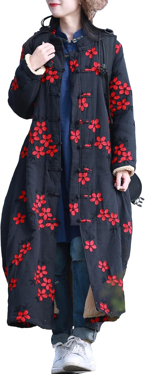 Women Trench Coat Floral Embroidered Jacket Thick with Pockets