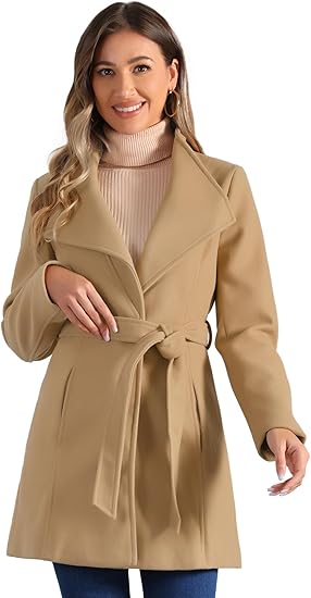 Women's Lapel Collar Double Breasted Wool Blend Coats Winter Pea Overcoat Pocketed Outwear with Belt