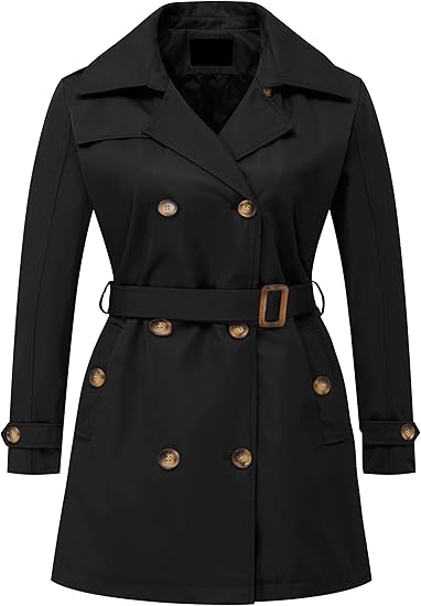 Women's Plus Size Double Breasted Trench Coats Mid-Length Belted Overcoat Dress Jacket with Detachable Hood