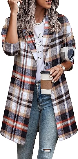 Women Plaid Jacket Mid Length Trench Coat Fall Wool Pea Coat with Pockets