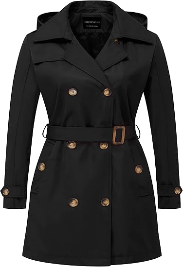 Women's Double Breasted Trench Coats Mid-Length Belted Overcoat Long Dress Jacket with Detachable Hood