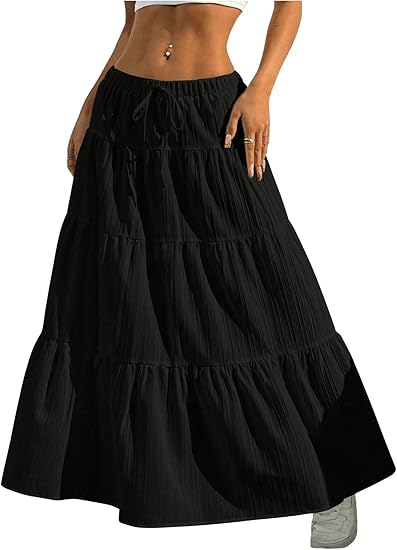 Women's Flared Ruffle Boho Long Skirts Low Waist Bow Flowy Summer Casual Skirt